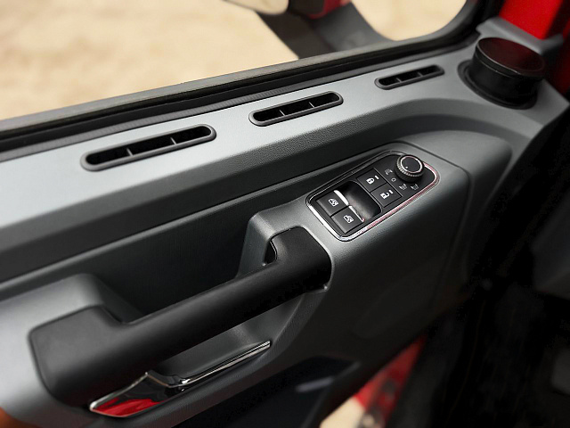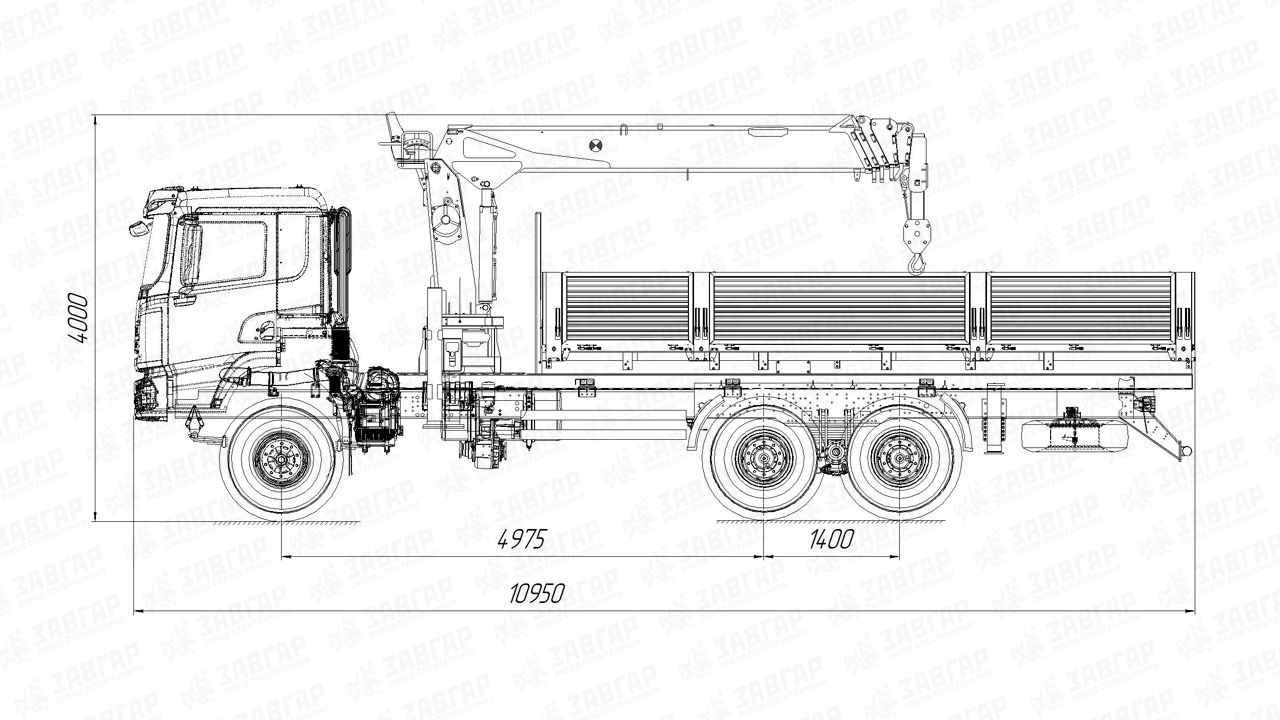 Для устойчивости и безопасности работы предусмотрены гидравлические выдвижные аутригеры с вылетом 6,0 метра спереди и 4,5 метра сзади. Бортовая платформа выполнена из стали и имеет размеры от 6200 до 8000 мм в длину, 2550 мм по ширине и с высотой борта 600 или 750 мм. За дополнительную плату доступны опции быстросъемных стоек и бортов, регулировки толщины и материала пола, а также погрузочной высоты и фитингов для надежного крепления грузов.