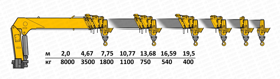 При работе на минимальном вылете (около 2 метров) кран способен поднимать груз весом до 8000 кг, а при максимальном вылете (19,5 метров) грузоподъемность составляет около 400 кг. Вес самой крано-манипуляторной установки составляет примерно 3800 кг.
